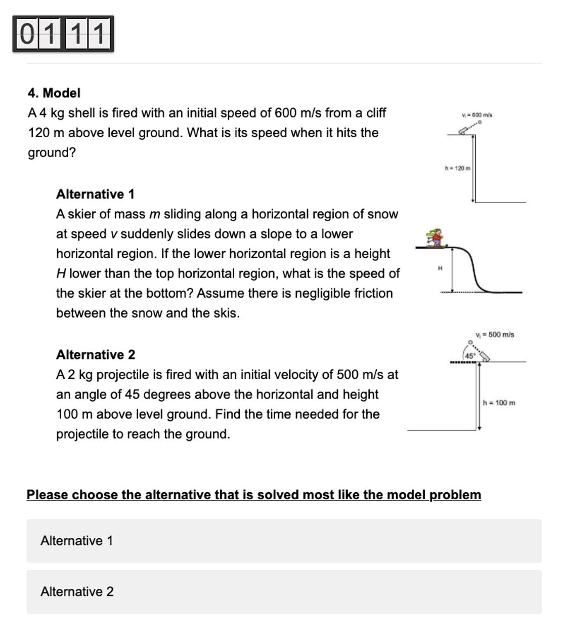 Supplementary Figure 2.2: At first glance, the model problem and alternative 2 appear similar because they both involve projectiles, but this similarity is a surface-level distractor. The model problem and alternative 1 are asking for final velocity and can be solved using conservation of energy, while alternative 2 requires the use of kinematics to solve for time. Therefore, the correct response is alternative 1.