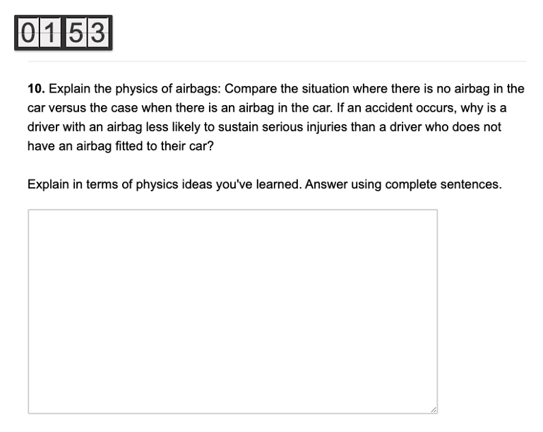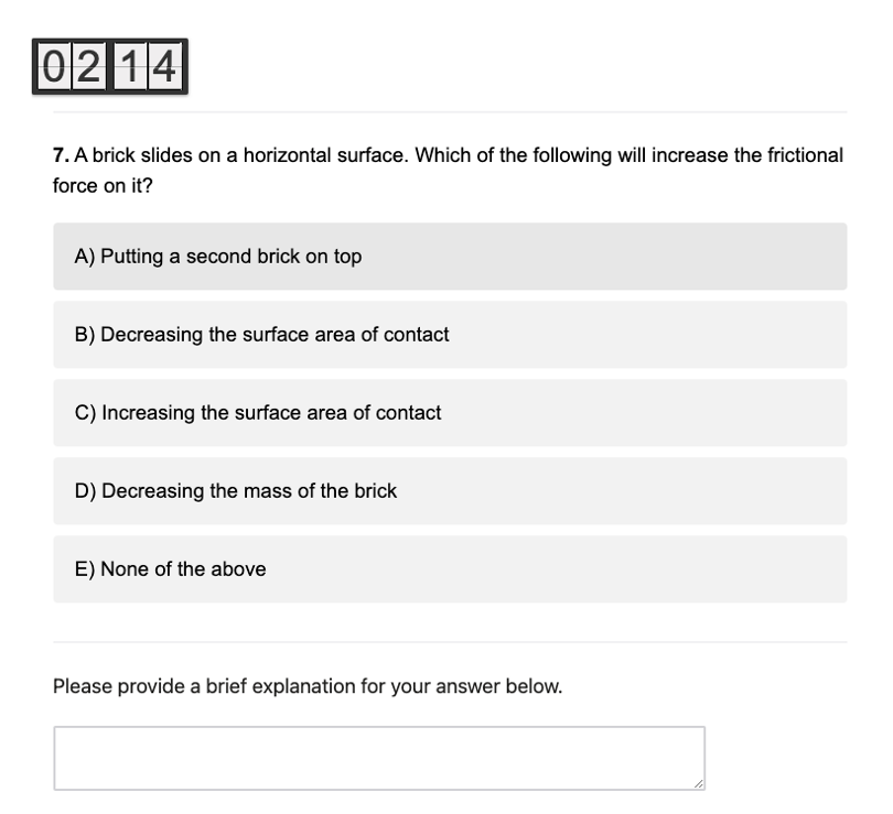 Supplementary Figure 2.3: Qualitative multiple-choice item: The correct answer is option A because the frictional force is proportional to the normal force, which is equal to the weight force. Therefore, the only way to increase the frictional force is to increase the mass; Supplementary Figure 2.4: Qualitative open response item: Newton’s second law states that \(F_{net}=\frac{Δp}{Δt}\). Airbags reduce the force (outcome) of a collision by increasing the time it takes for the collision to occur (mechanism). Half credit was given to responses that mentioned either force or time correctly, and full credit was given to responses that mentioned both force and time.
