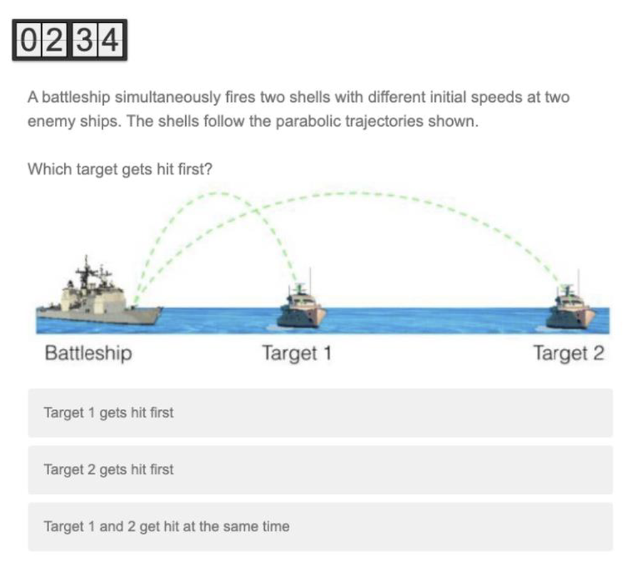 The Preparation for Future Learning (PFL) task (Belenky and Nokes-Malach 2012; Schwartz and Martin 2004) is a 3-part learning activity that participants completed only at posttest. Physics problems used in the learning activity were taken from Weinlader et al. (2019). The first part consisted of solving a difficult multiple-choice problem which required comparing the trajectories of two projectiles and predicting which would hit their target first (see Supplementary Figure 2.5). In the second part, a learning resource explaining the first problem was provided. The resource contained an explanation of why the correct answer choice was valid, and why each incorrect answer was not. The third part consisted of a novel problem with similar surface features to the first problem but had a different correct response. Answering correctly required applying the underlying principles of the first problem to a different set of conditions. Each of the two problems required both a multiple-choice answer as well as a short-answer explanation for the selected choice.
